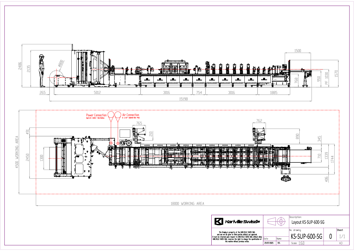 All Karlville Swiss pouch machines have embedded a dynamic braking energy storage device to create more sustainability in drive technology and lowering operational costs and a static energy storage device that protects against damage from temporary power failures. Only 6KWH consumption during production.